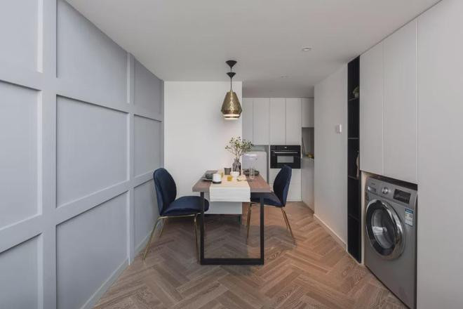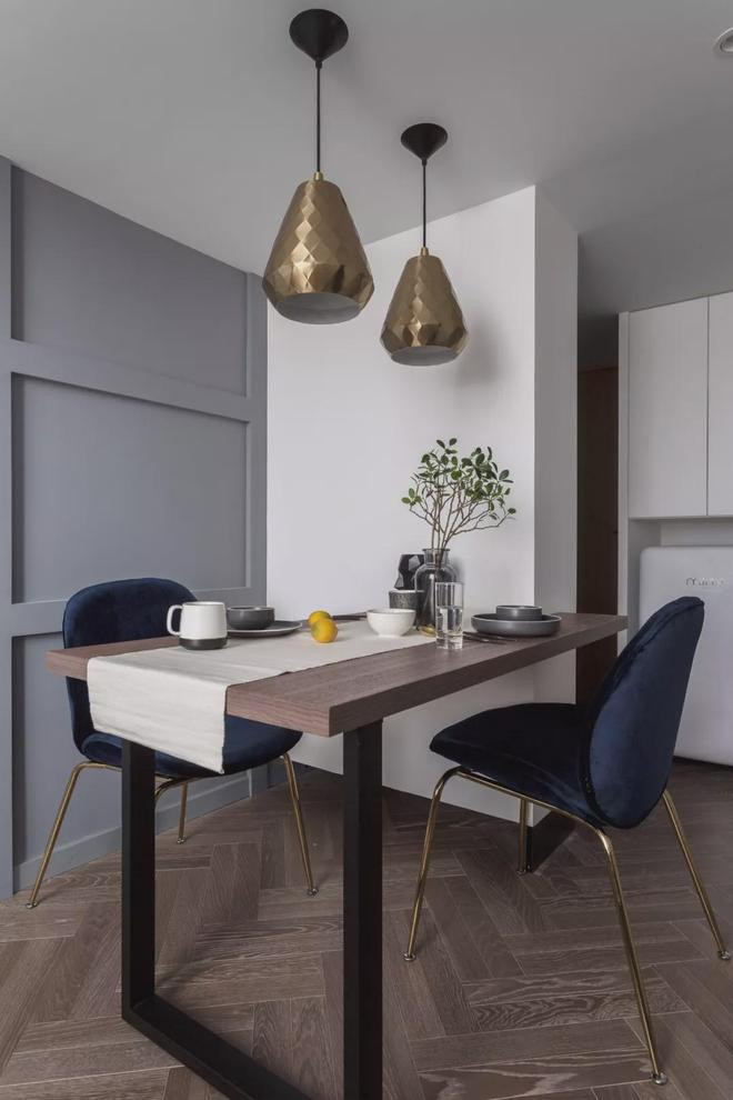 餐桌椅的款式是比较简约和精致的,木质桌面和黑色桌脚,imtoken官方版app下载餐椅由蓝色布艺坐垫和金属脚结合,搭配灰蓝色的背景墙和人字铺的地板,很有格调感。