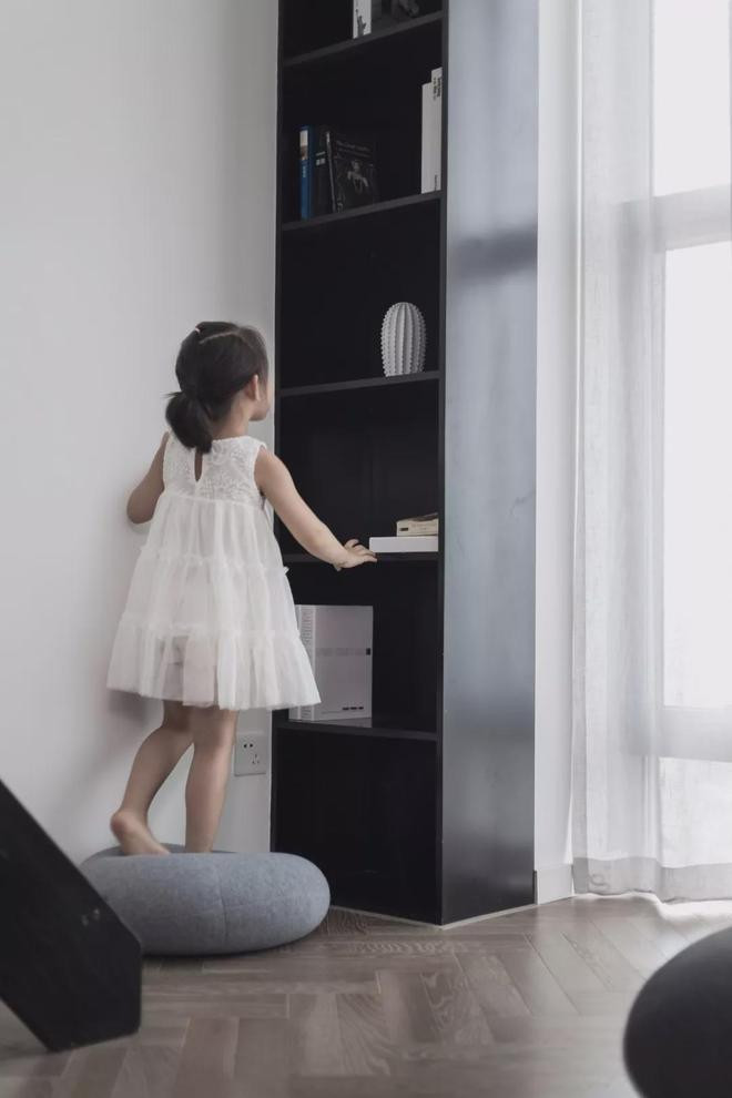 在休闲区的角落里还做了一个黑色的书架,和楼梯相互呼应,整面落地窗搭配纱帘的设计,让光线变得更加的柔和、舒适。